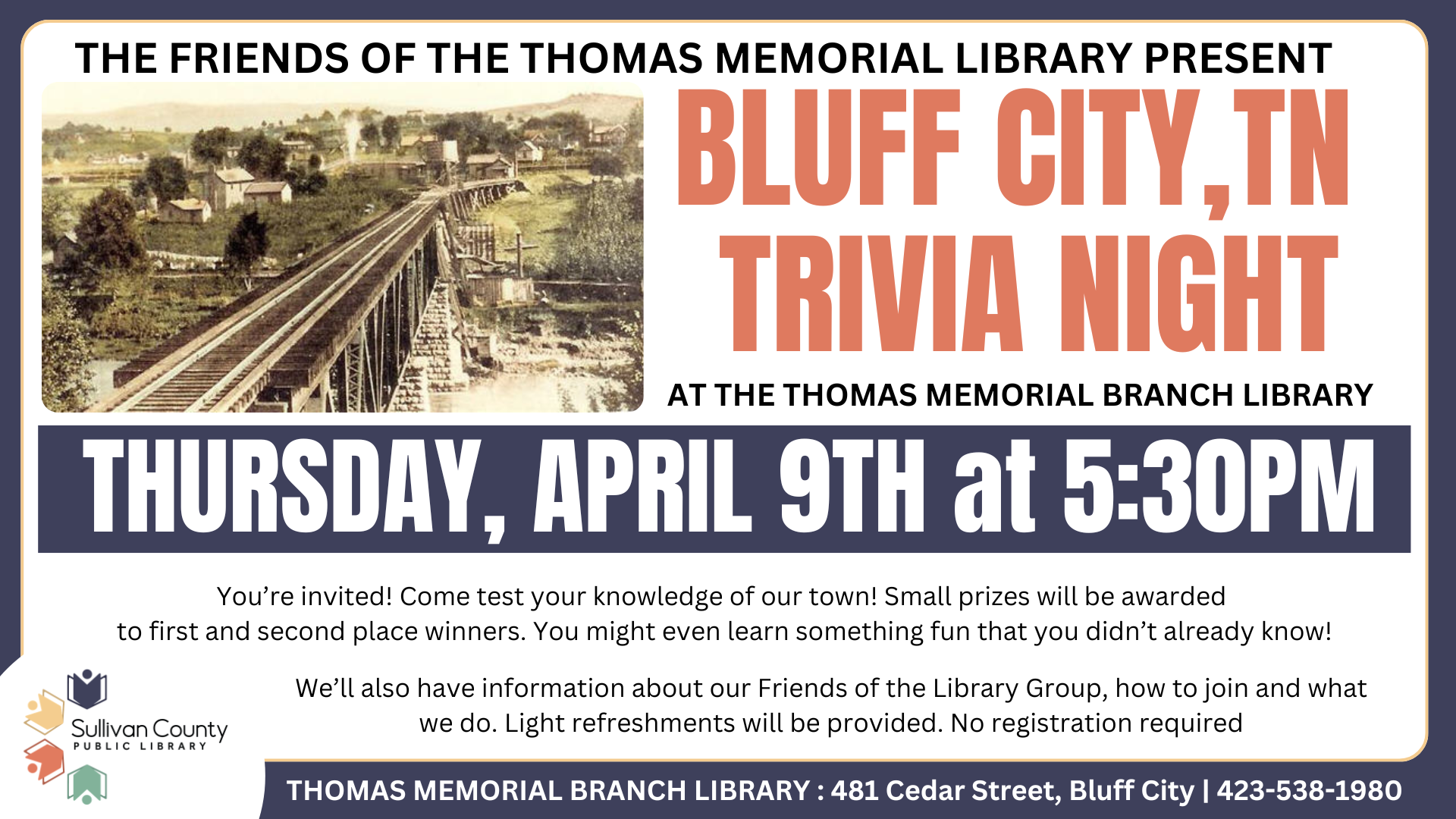 Held at the Old Blountville Middle School next door to the Blountville branch. Proceeds will go to fund programs at the Sullivan County Public Libraries. THURSDAY, APRIL 23 - 5pm […]