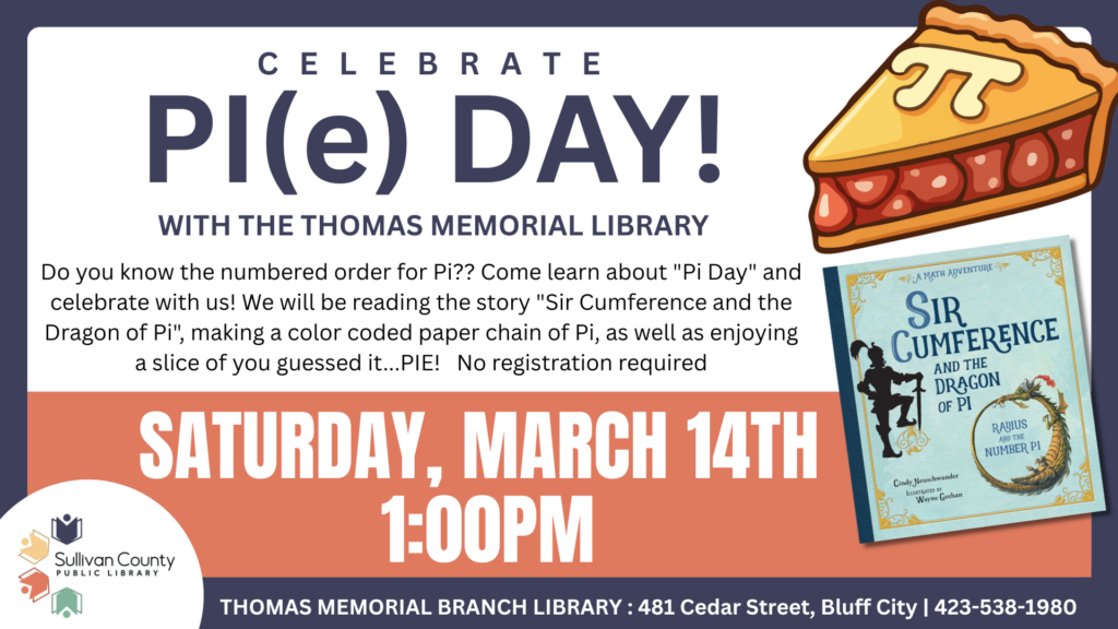 Do you know the numbered order for Pi?? Come learn about “Pi Day” and celebrate with us! We will be reading the story “Sir Cumference and the Dragon of Pi”, making a color coded paper chain of Pi, as well as enjoying a slice of you guessed it…PIE! No registration required.