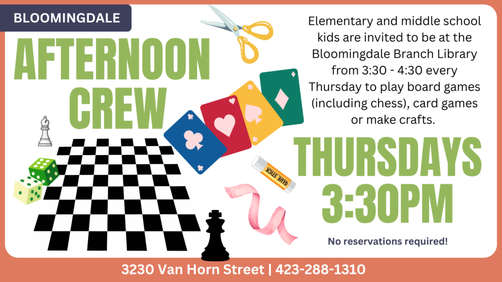 Elementary and middle school kids are invited to be at the Bloomingdale Branch Library from 3:30 – 4:30 every Thursday to play board games (including chess), card games or make crafts.