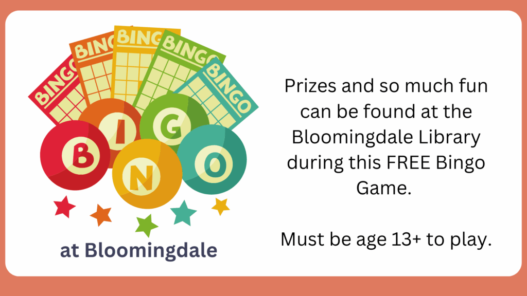 Come play Bingo and maybe win a prize or two! We start at 4:00 pm at the Ruritan Building next door to the Bloomingdale Branch Library.