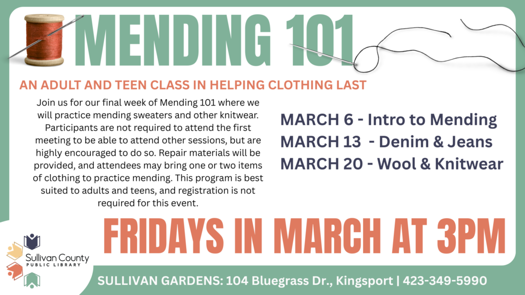 Join us for the third week of Mending 101 and learn how to darn your holey socks. Participants are not required to attend the first meeting to be able to attend other sessions, but are highly encouraged to do so. Repair materials will be provided, and attendees may bring one or two items of clothing to practice mending. This program is best suited to adults and teens, and registration is not required for this event.