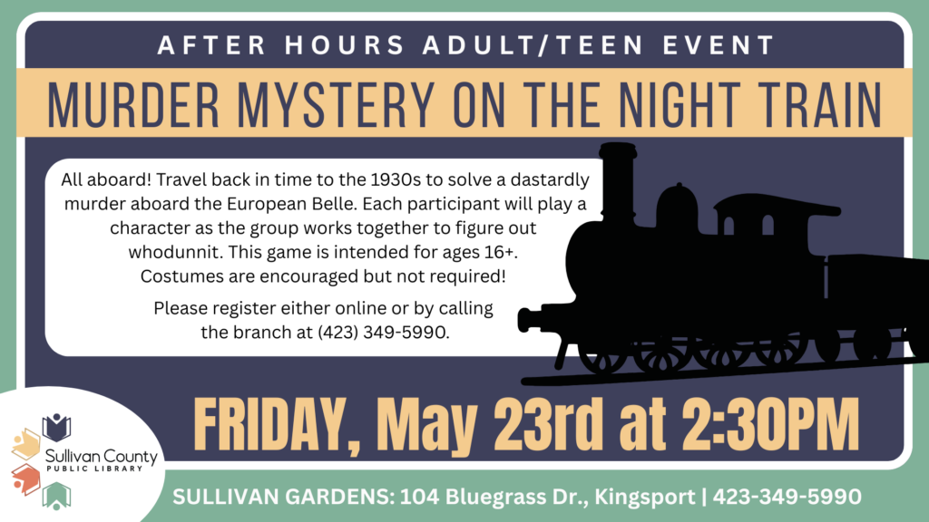 All aboard! Travel back in time to the 1930s to solve a dastardly murder aboard the European Belle. Each participant will play a character as the group works together to figure out whodunnit. This game is intended for ages 16+. Costumes are encouraged but not required! Pease register either online or by calling the branch at (423) 349-5990.