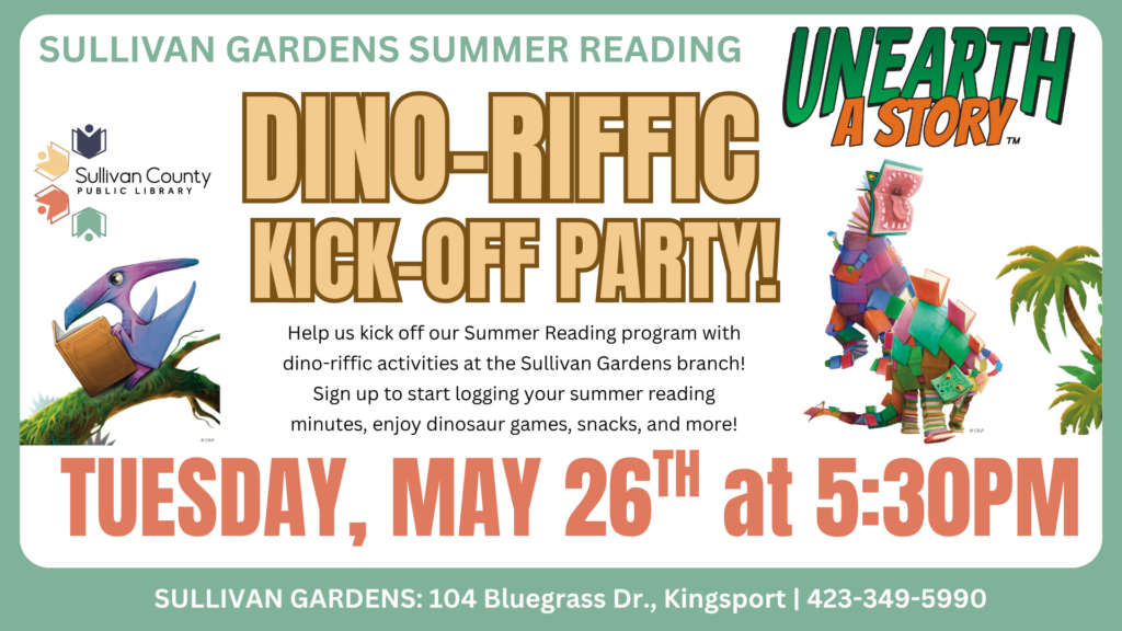 Help us kick off our Summer Reading program with dino-riffic activities at the Sullivan Gardens branch! Sign up to start logging your summer reading minutes, enjoy dinosaur games, snacks, and more!