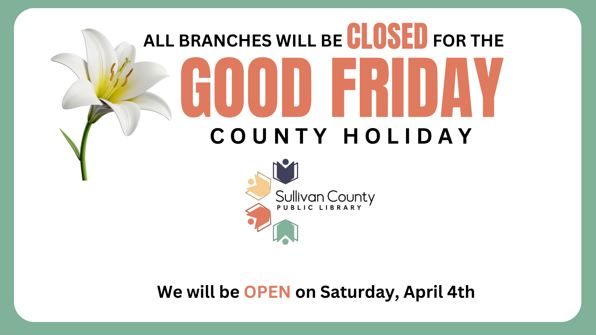 All BranchesAll branches of the Sullivan County Public Library will be closed in observance with the Veteran's Day Holiday. We will reopen on Wednesday with our regular hours.